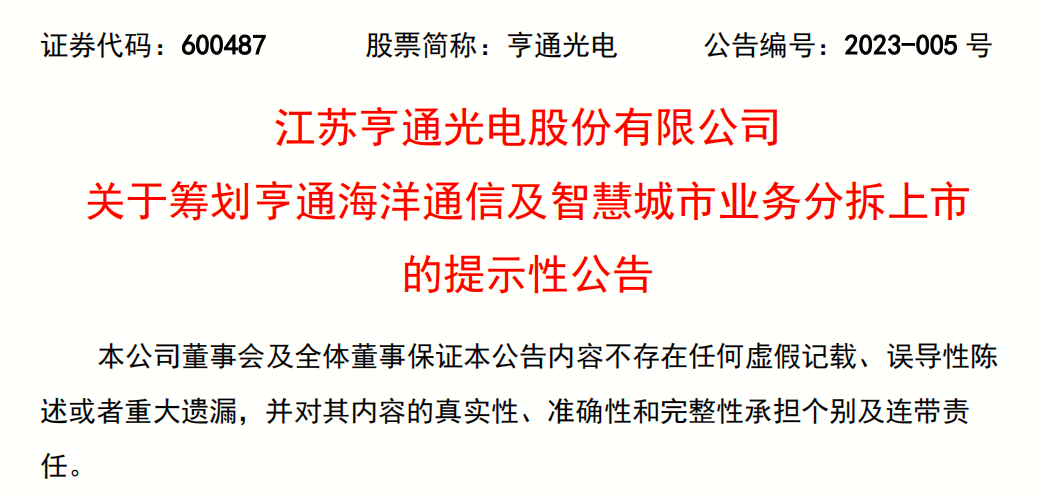 近日,江苏亨通光电股份有限公司发布公告称,公司拟分拆控股子公司江苏亨通海洋光网系统有限公司至境内证券交易所上市。同时,亨通海洋光网还拟增发不低于10%的股份,具体以届时董事会、股东大会决策以及相关证券监管机构批准注册后的数量为准。