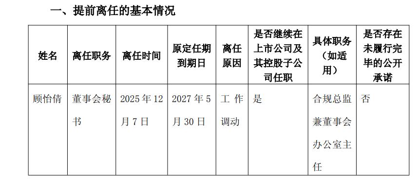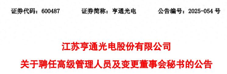 公告显示,江苏 亨通光电 股份有限公司董事会收到董事会秘书顾怡倩因工作调动的书面辞职报告,其于2025年12月7日不再担任公司董事会秘书职务,原定任期到2027年5月30日,后续将担任公司合规总监兼董事会办公室主任,且不存在未履行完毕的公开承诺,其岗位变动对公司正常经营无不利影响。