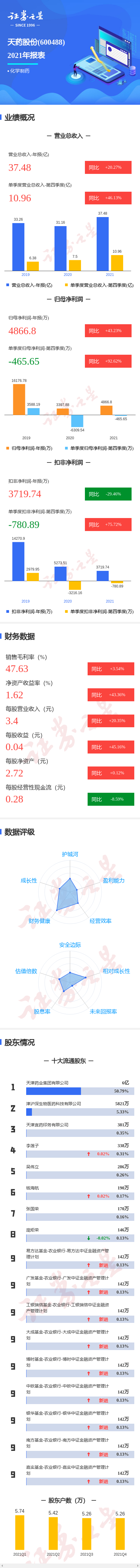 天药股份2021年报显示,公司主营收入37.49亿元,同比上升20.27%;归母净利润4866.8万元,同比上升43.23%;扣非净利润3719.75万元,同比下降29.46%;其中2021年第四季度,公司单季度主营收入10.96亿元,同比上升46.13%;单季度归母净利润-465.65万元,同比上升92.62%;单季度扣非净利润-780.89万元,同比上升75.72%;负债率39.84%,投资收益498.54万元,财务费用4523.51万元,毛利率47.63%。
