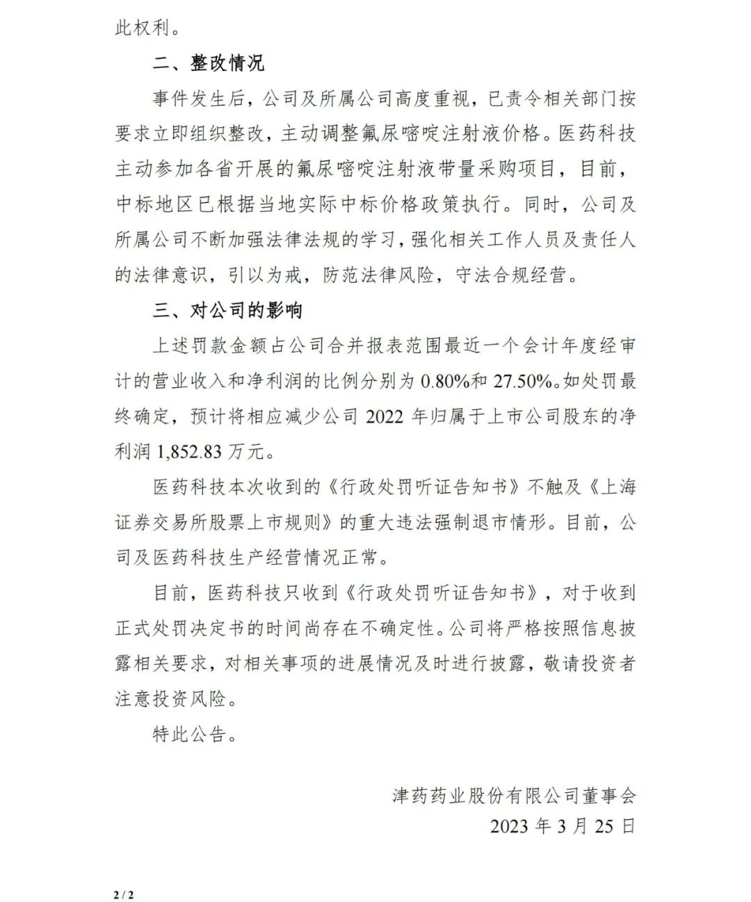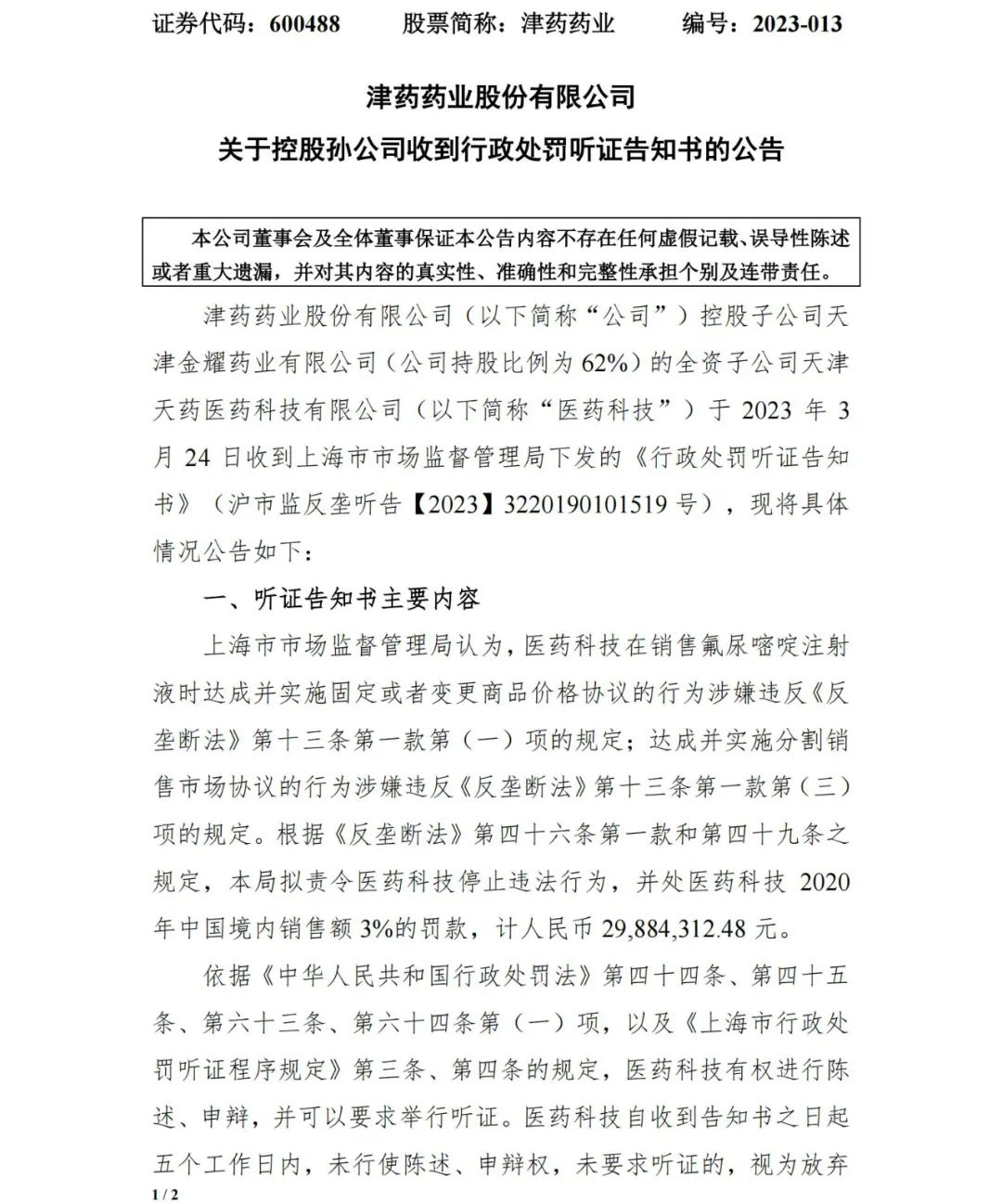 2023年3月25日,津药药业股份有限公司(“津药药业”)发布公告,津药药业旗下子公司天津金耀药业有限公司(“天津金耀”)的全资子公司天津天药医药科技有限公司(“医药科技”)被上海市市场监督管理局(“上海市市监局”)罚款2988万元。上海市市监局认为,医药科技在销售氟尿嘧啶注射液时达成并实施了固定或者变更商品价格协议以及分割销售市场协议,责令停止违法行为,并处2020年度销售额3%的罚款,约2988万元。津药药业表示,已按要求立即组织整改,主动调整氟尿嘧啶注射液价格,并加强法律法规学习,目前津药药业及医药科技生产经营情况正常。此前不久,天津金耀曾因滥用市场支配地位被罚2772万元,津药药业也曾在2021年因原料药垄断被罚4402.26万元。(竞争法视界)