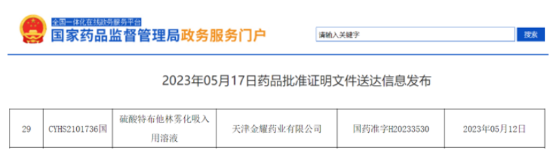 5月22日,津药药业股份有限公司(以下简称“公司”)发布公告称,子公司天津金耀药业有限公司(以下简称“子公司”)收到国家药品监督管理局核准签发的硫酸特布他林雾化吸入用溶液(以下简称“该药品”或“本品”)的《药品注册证书》。据悉,该产品由子公司于2021年9月向国家药品监督管理局药品审评中心提交国产药品注册申请并获受理。