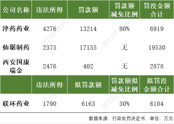 在此次行政处罚中,仙琚制药被罚没金额最高,近2亿元,无任何罚款减免,西安国康瑞金被罚没款金额最低,为2877万元,也无罚款减免。
