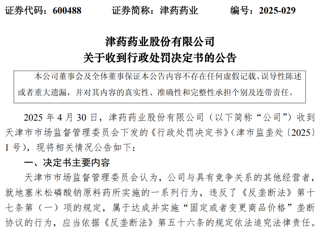 2023年4月,津药药业控股孙公司天津天药医药科技有限公司在销售氟尿嘧啶注射液时,达成并实施“固定或者变更商品价格协议”的行为,被上海市市场监督管理局罚款2988.43万元。