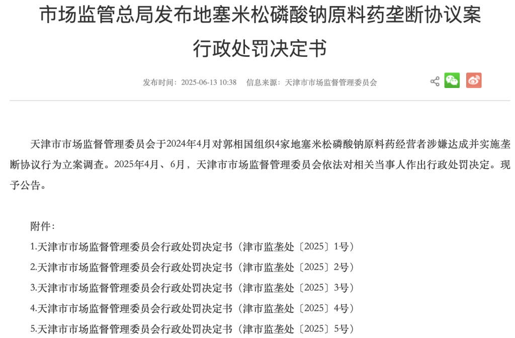 6月13日,国家市场监管总局发布《地塞米松磷酸钠原料药垄断协议案行政处罚决定书》显示,天津市市场监督管理委员会于2024年4月对郭相国组织4家地塞米松磷酸钠原料药经营者涉嫌达成并实施垄断协议行为立案调查。