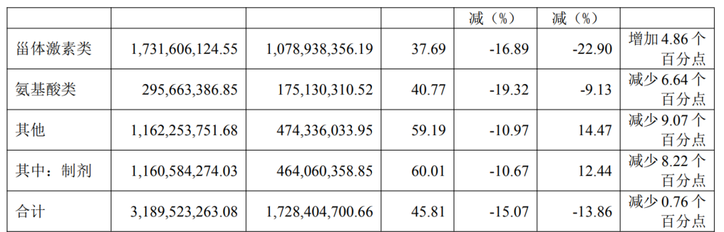 在公告中,公司将销售费用锐减归因于“集采政策执行”和“营销模式升级”。真实情况是,2024年,其纳入集采的主要制剂产品销售额同比下降16.5%至7亿元,销售费用更是锐减65.26%,其他产品销售费用也下降41.83%。核心甾体激素类与氨基酸类产品收入分别下滑16.89%和19.32%,“以价换量”策略的短板逐渐显现。