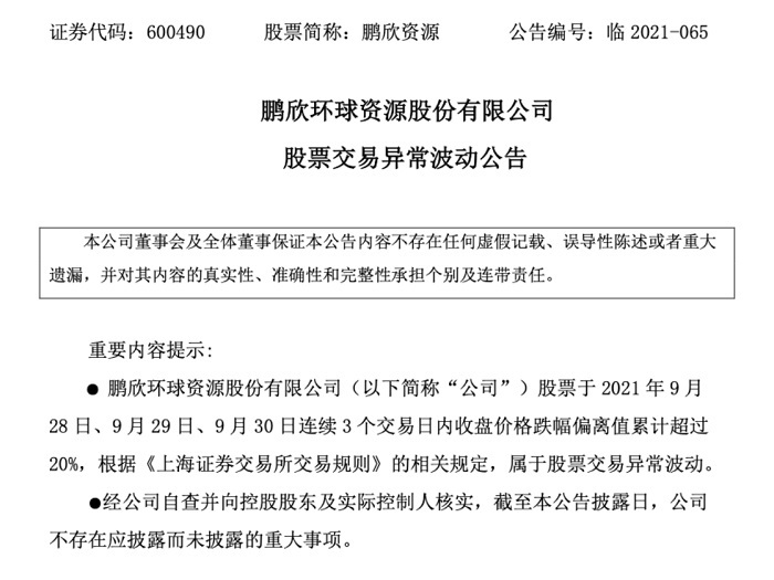 2021年10月8日,600490鹏欣资源发布《股票交易异常波动公告》称,公司股票于2021年9月28日、9月29日、9月30日连续3个交易日内收盘价格跌幅偏离值累计超过20%。