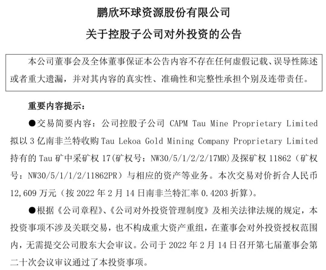 2月16日,鹏欣资源公告,控股子公司CAPM Tau Mine Proprietary Limited(下称“CAPM-TM”)于2月14日与Tau Lekoa Gold Mining Company Proprietary Limited(下称“TLGM”)等三方签署《收购协议》,收购TLGM持有的Tau矿中采矿权17及探矿权11862与相应的所有权、财产等业务,基准购买价格为3亿兰特,折合人民币1.26亿元。