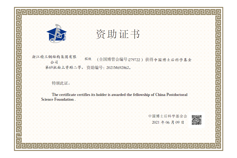 程欣博士于2021年6月9日喜获中国博士后科学基金会第69批二等面上资助,成为精工钢构国家级博士后工作站首位带资进站的博士。