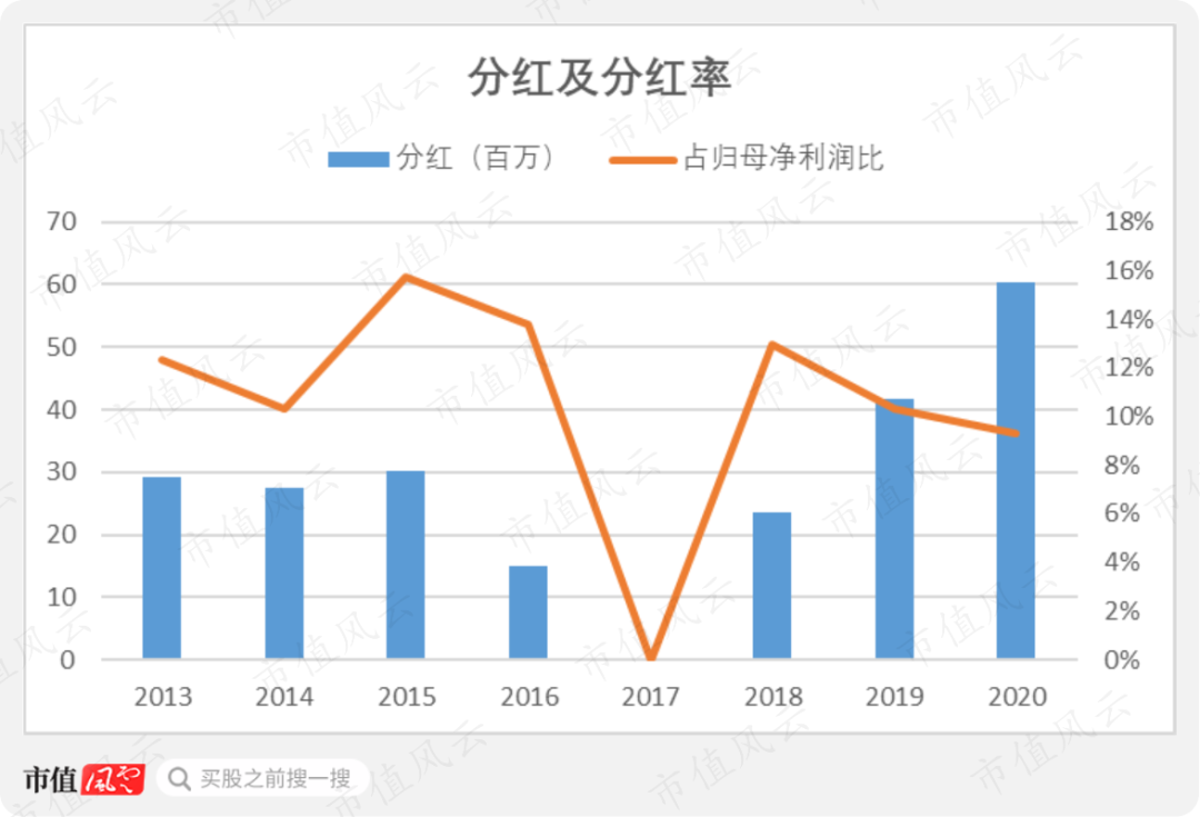 而在此之前,公司的分红记录堪称“铁公鸡”,是能力不足和意愿不强的典范,最高的一年也没有超过当年归母净利润的16%。