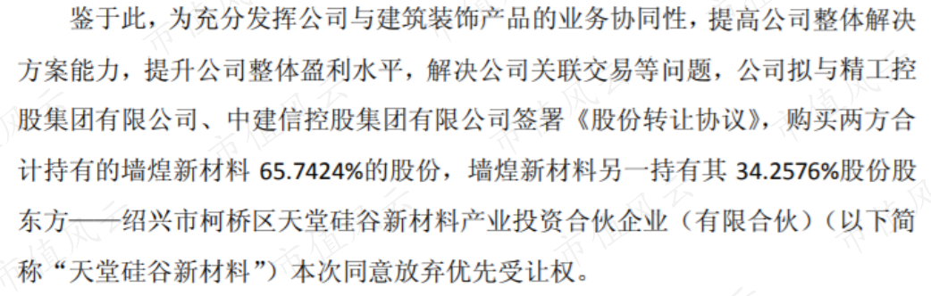 安排是这样:公司从关联方中建信、精工控股手中购买墙煌新材料65.7424%股权,对价4.8亿,增值部分主要是土地。