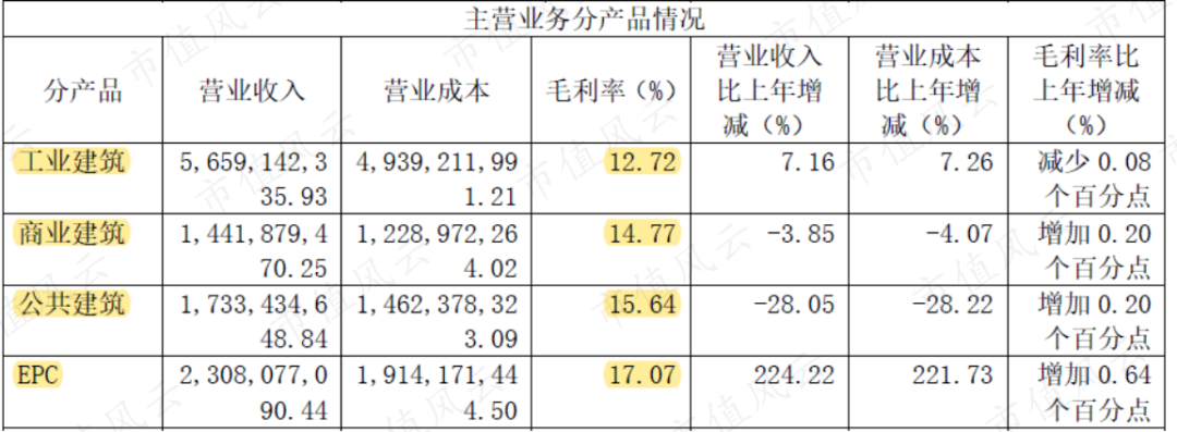 而根据2020年报披露,贡献超10亿的四种主要产品中,EPC提供的毛利率无疑是“矮子里的将军”,比工业建筑、商业建筑、公共建筑都要高一截。