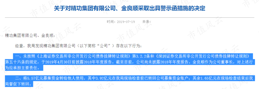 2019年7月,浙江证监局对精功集团有限公司、金良顺采取出具警示函措施的决定,原因包括未在4月30日前披露2018年报、5.57亿元募集资金转给他人使用。