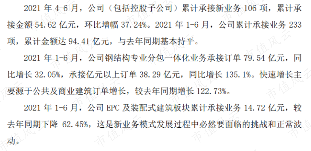 根据公司最新披露,2021年上半年,分包业务承接订单80亿,同比增32%;其中规模过亿的有38亿,同比增长135%。