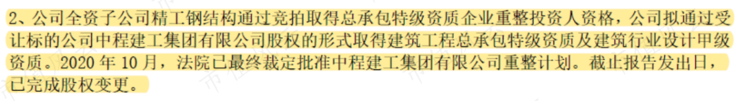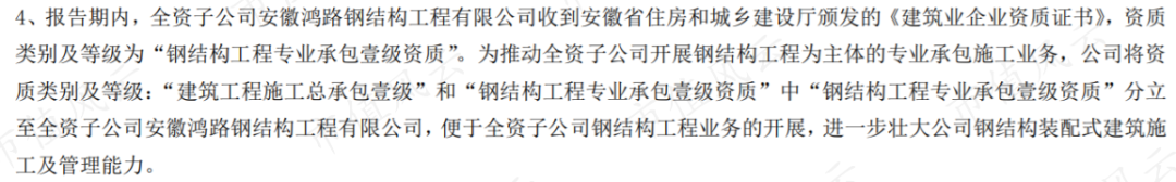 鸿路钢构直到2021年半年报才出现了施工、承包资质的相关内容,2020年报中都还没有。