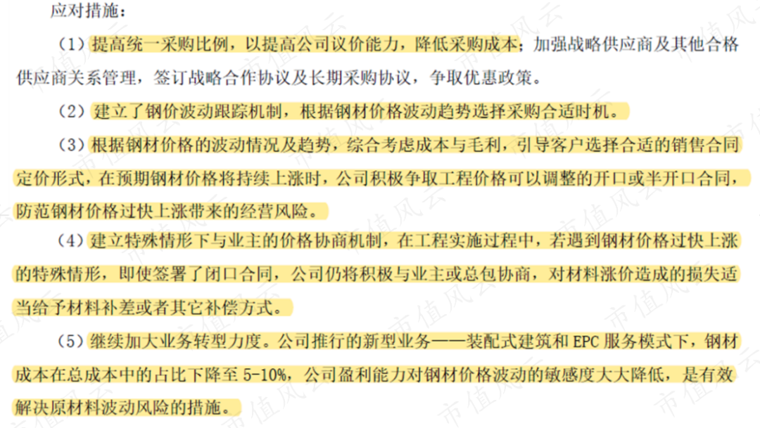 这当中,公司强调,装配式建筑和EPC服务模式下,钢材成本在总成本中的占比下降至5-10%,盈利能力对钢材价格波动的敏感度大大降低。