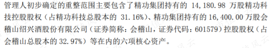 根据今年7月底精功科技(002006.SZ)发布的、关于公司控股股东司法重整的进展公告,精功集团持股31.16%的精功科技在列、持股32.97%的会稽山(601579.SH)在列。