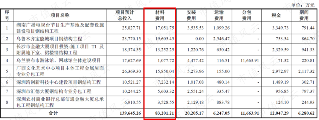 我们以公司2017年非公开发行股票披露的信息为例,可以看出,项目成本方面,材料、安装、运输和分包费用是大头,而这当中又以材料费用为主,占到项目总投入的近60%。