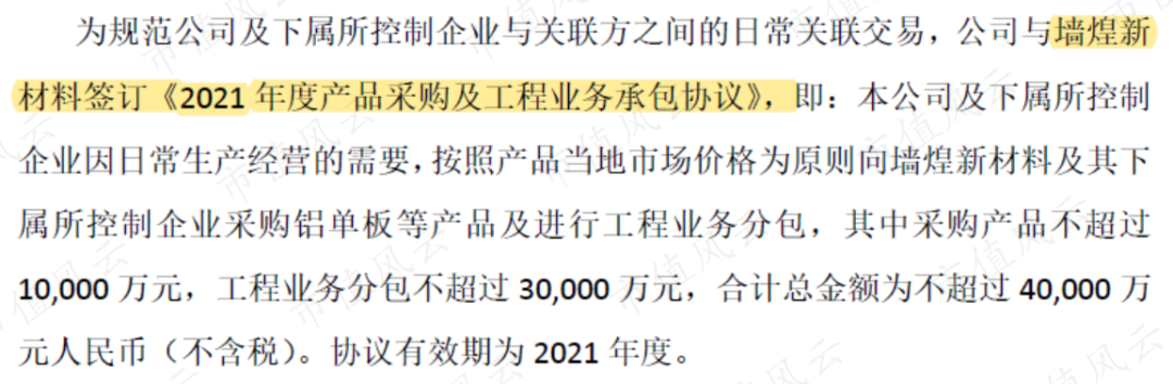 从公司最新公告来看,目前墙煌新材料确实也是公司关联交易的两个主要构成部分之一,2021年预计采购总金额不超过4亿;而2020年全年预不超过6亿,实际发生采购1.5亿。