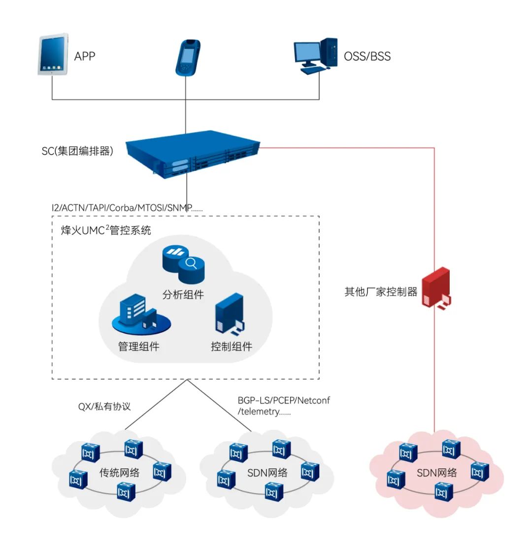 烽火通信UNM2000管控一体方案集成了SDN功能,通过集中化自动算路可以快速、精准的完成业务配置数据下发。该方案在控制平面采用层次化控制架构,分为域内控制器(D-Controller)和域间控制器(S-Controller),其中域内控制器负责域内业务的控制,并通过南向接口控制转发面设备。域间控制器负责域间业务的控制,通过调用域内控制器提供的北向接口,完成全网的资源协调和业务调度,实现网络资源的跨域协同控制。