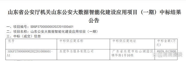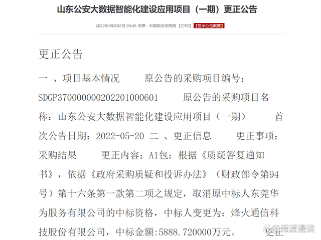 大致的意思是:今年5月20日,东莞华为服务有限公司在首次公告中,中标山东公安大数据智能化建设应用项目(一期),但日前山东省政府采购中心公告称,根据《质疑答复通知书》,依据《政府采购质疑和投诉办法》第十六条第一款第二项规定,取消原中标人中标资格,中标人变更为烽火通信科技股份有限公司,中标金额为5888.72万元。