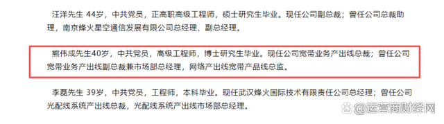据烽火通信今年公布的2021年度报告摘要显示,熊伟成40岁,高级工程师,博士研究生毕业。曾任公司宽带业务产出线副总裁兼市场部总经理,网络产出线宽带产品线总监。