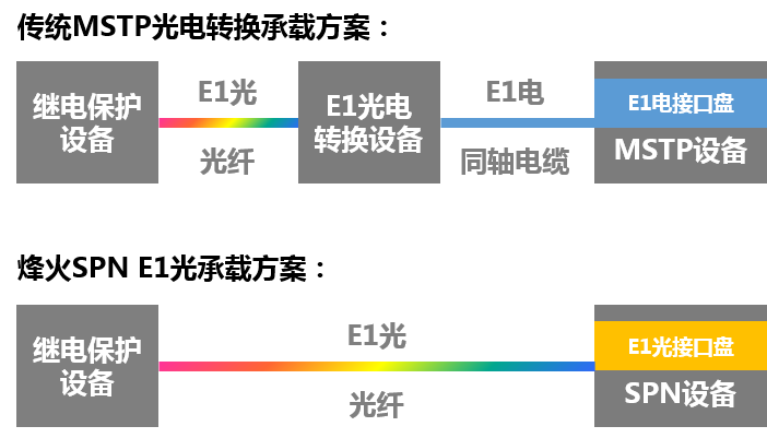 继电保护业务对于电网的发、输、变、配及重要用电设备的稳定安全运行至关重要,但是传统继保业务传输时需经过光电转换设备,将E1光信号转换为E1电信号与MSTP设备对接,光电转换的过程需要额外采购光电转换设备,且会导致继保业务因为分段的光纤、电缆转接过程增加故障发生率。烽火通信SPN设备在满足电力通信网超低时延、海量连接、安全可靠、绿色低碳、智能控制五个维度智能电力通信网需求的同时,还开发了8路光口的E1光接口盘,为继电保护业务承载贡献三大价值: