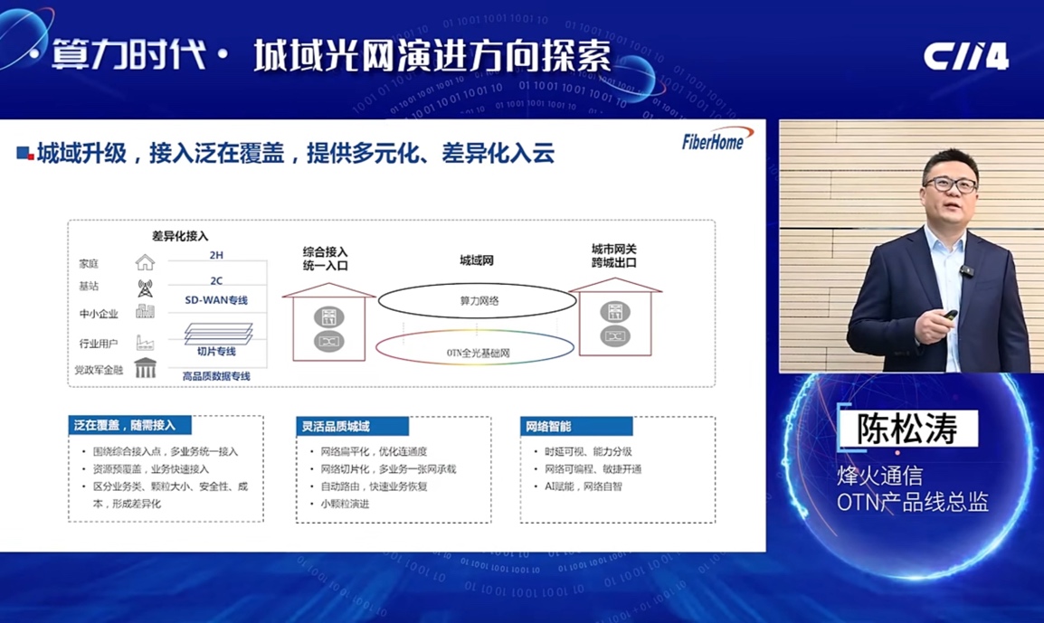今日下午,在C1114举办的“算力时代,城域光网演进方向探索研讨会”上,烽火通信OTN产品线总监陈松涛发表演讲,畅谈了“智慧光网”在城域光网络发展中的价值。