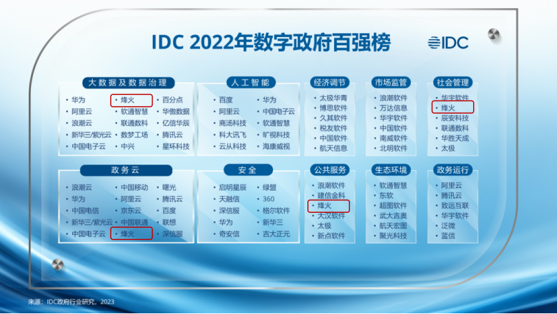 近日,国际权威咨询机构IDC发布《2022年数字政府百强榜》,该榜单根据2022年IDC政府行业组在数字政府领域的研究,评估了技术提供商的市场能力及市场份额,涵盖十个技术领域模块。其中,烽火进入大数据及数据治理、政务云、社会管理、公共服务四大模块榜单。