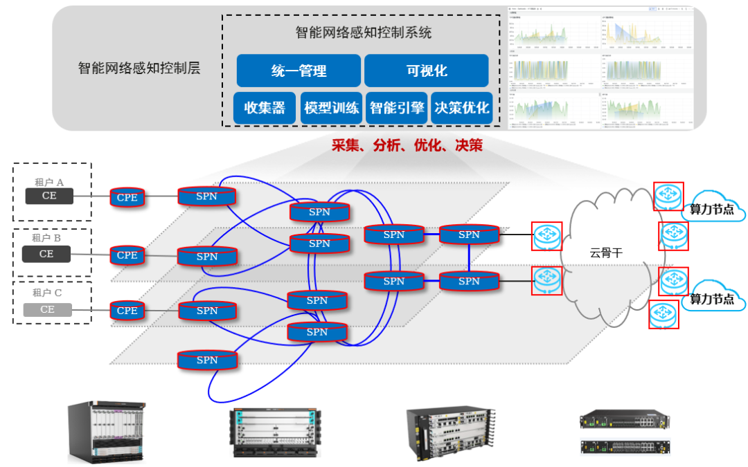 为验证这一标准体系的可行性和应用性,烽火通信基于ITU-T Y.3184标准成功研制出智能网络感知的原型机系统。该系统采用灵活的数据采集策略、高效的智能算法和精准的决策引擎,以实现对网络状态的智能感知和实时决策。系统可实现以下功能: