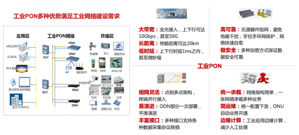 为此,烽火通信提出了工业PON“一网到底,云网协同”的理念和网络架构,为工业企业提供一张高质量、高可靠、高安全性的通信网络。