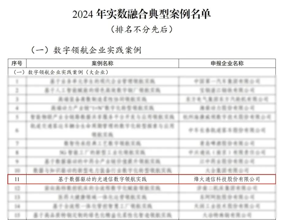 近日,工业和信息化部公示了2024年实数融合典型案例名单,烽火通信“基于数据驱动的光通信数字领航实践”成功入选“数字领航”大企业名单。