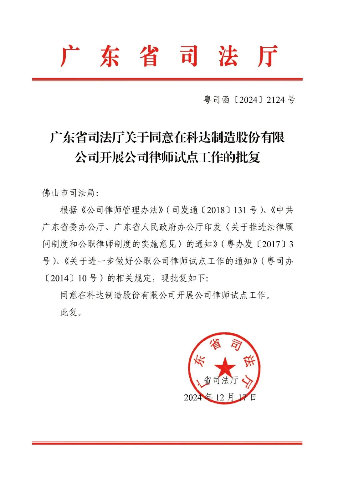 2024年底,科达制造股份有限公司成功获得广东省司法厅“公司律师试点工作”批复,成为顺德区第四家获此资质的民营企业(前三家分别为美的集团、美的置业及顺德农商银行)。