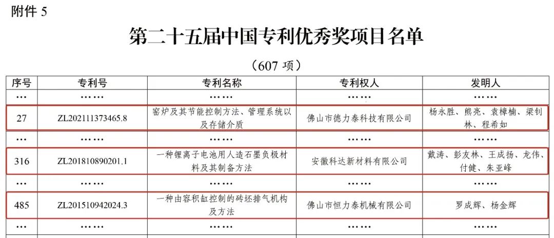 其中,恒力泰机械的《一种由容积缸控制的砖坯排气机构及方法》、德力泰科技的《窑炉及其节能控制方法、管理系统以及存储介质》、安徽新材料的《一种锂离子电池用人造石墨负极材料及其制备方法》获第二十五届中国专利优秀奖。