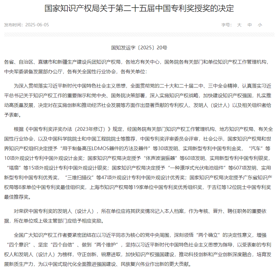 6月5日,国家知识产权局公布第二十五届中国专利、中国外观设计金奖、银奖及优秀奖获奖名单。
