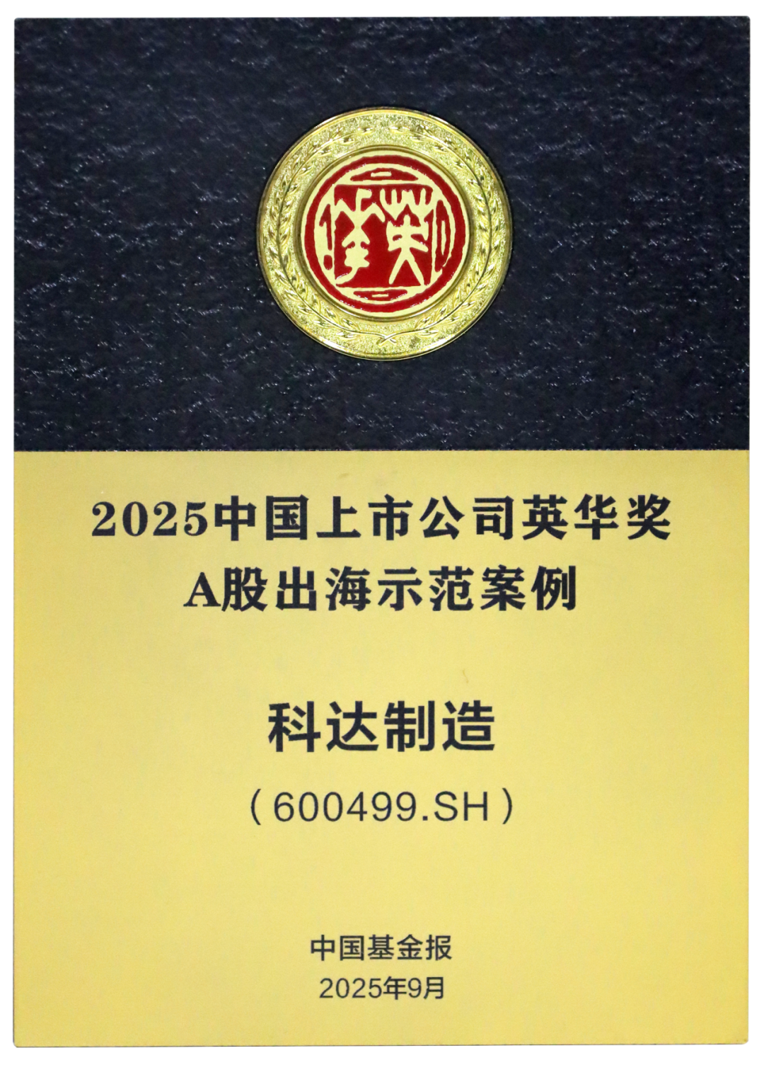 2025年9月16日,由中国基金报主办的2025中国资本市场发展论坛暨上市公司论坛在上海举办。在此次论坛上,科达制造(股票代码:600499)凭借优异的全球化成果、广泛的行业影响力,以及扎实的社会责任实践,成功荣登“2025中国上市公司英华奖A股出海示范案例”榜单。