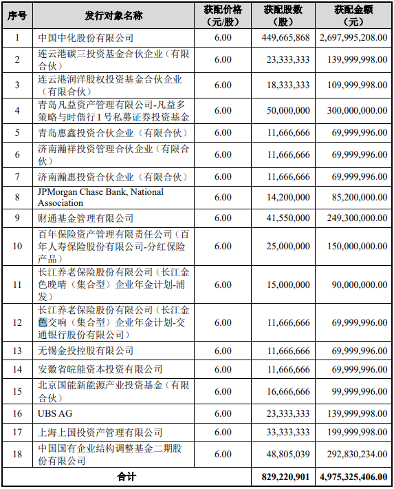 中化国际12月7日披露非公开发行股票发行情况报告书,此次发行最终获配发行对象共计18名,发行价格为6元/股,此次发行股票数量为8.29亿股,募集资金总额约49.75亿元,其中,中化股份获配26.98亿元,财通基金获配2.49亿元,UBS AG获配1.40亿元。