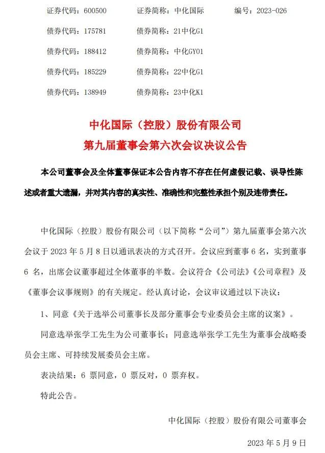 同日,中化国际发布公告:同意选举张学工先生为公司董事长;同意选举张学工先生为董事会战略委员会主席、可持续发展委员会主席。中化国际官网已经进行了相关更新!