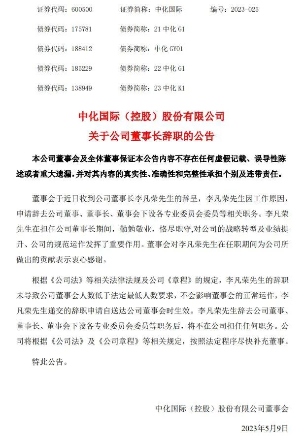 中化国际董事会于近日收到公司董事长李凡荣先生的辞呈,李凡荣先生因工作原因,申请辞去公司董事、董事长、董事会下设各专业委员会委员等相关职务。