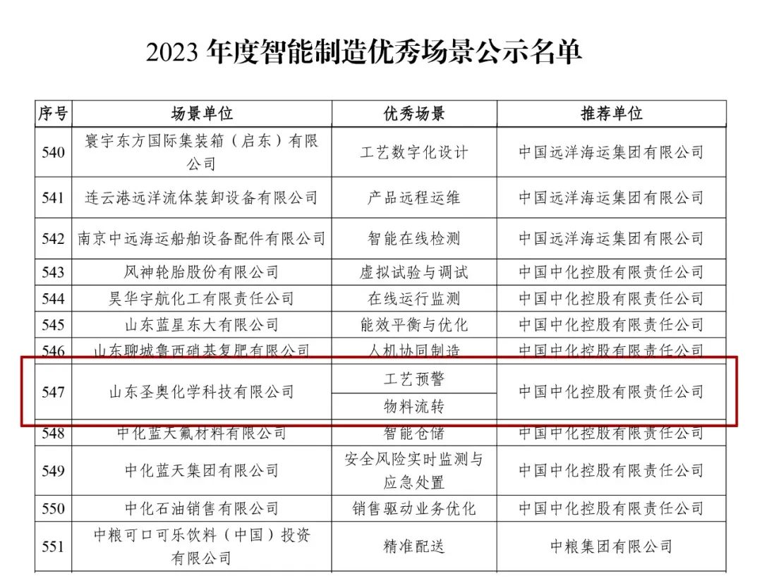 12月6日,工信部公布了“2023年度智能制造示范工厂揭榜单位和优秀场景名单”,中化国际旗下山东圣奥“工艺预警”和“物料流转”两个智能制造场景入选,充分体现了公司在智能制造和数字化转型方面取得的阶段性成果。