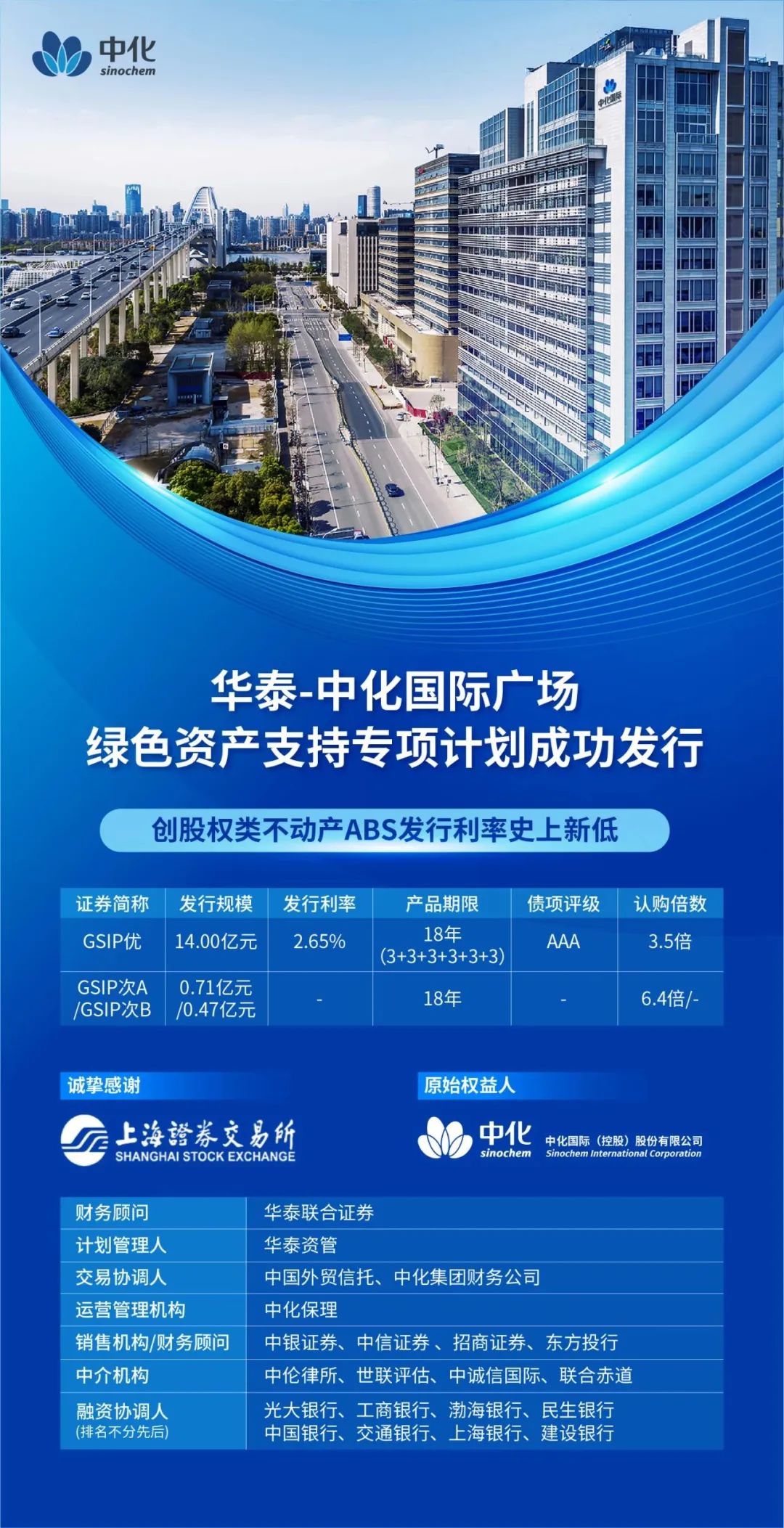 近日,中化国际(控股)股份有限公司(下称“中化国际”)成功在上海证券交易所发行华泰-中化国际广场绿色资产支持专项计划(以下简称“专项计划”),项目规模15.18亿元,优先级票面利率2.65%,创下产权类不动产ABS(资产证券化)发行利率新低。中化保理、外贸信托等中国中化兄弟单位,充分发挥集团内部协同优势和专业特长,助力兄弟公司中化国际进一步盘活存量资产、优化经营模式、提升运营效率。