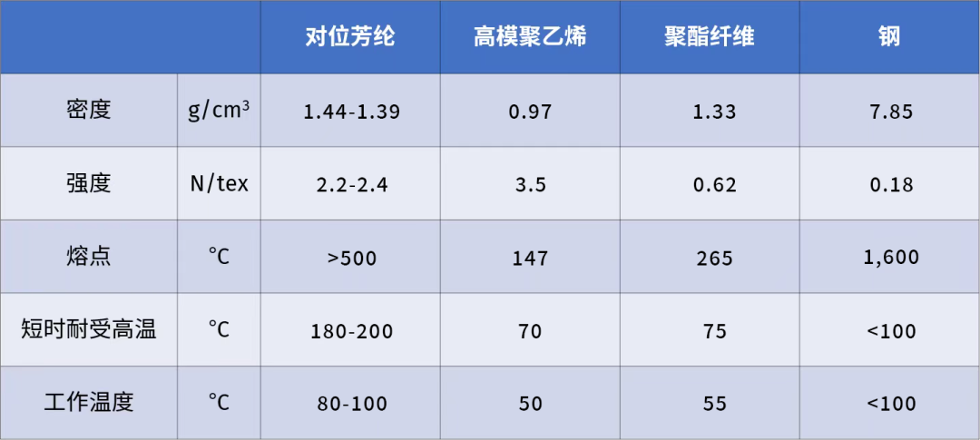 和现有的系泊缆绳材料相比较,对位芳纶纤维在性能上具备显著的综合优势: