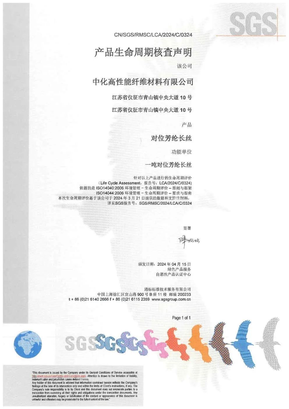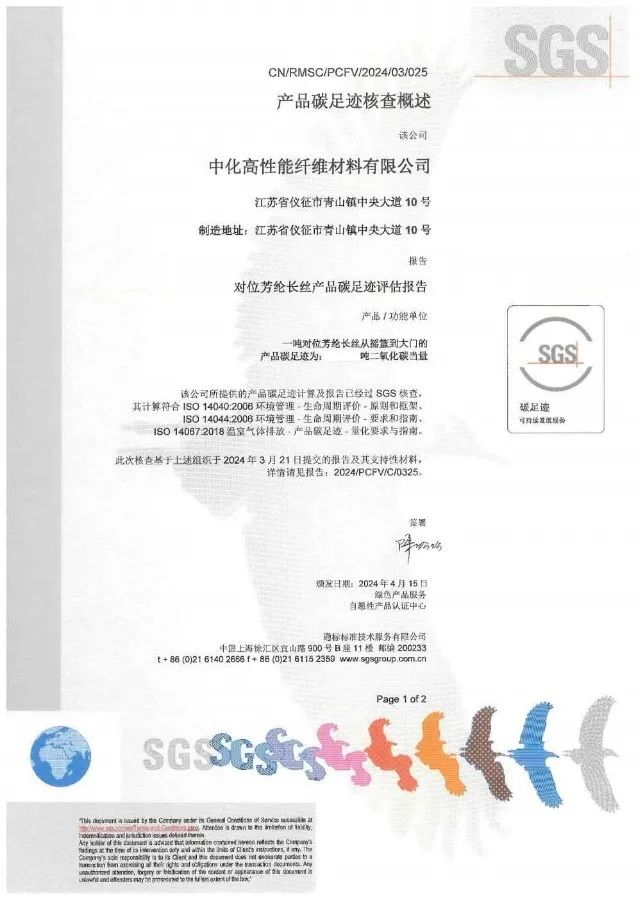 2024年,中化国际大力推进对位芳纶产品碳足迹量化工作,旨在全面摸清碳排放“家底”,并根据碳排放“热点”区域有的放矢地制定碳排放管控策略。目前,公司已完成对位芳纶长丝产品LCA评估(Life Cycle Assessment,即产品生命周期评估)和产品碳足迹核查,并获得第三方权威认证机构SGS基于ISO14040、ISO14044及ISO 14067标准的认证。这将确保公司为客户提供准确可靠的产品碳排放数据,有力支持客户和下游行业的碳管理和可持续发展。