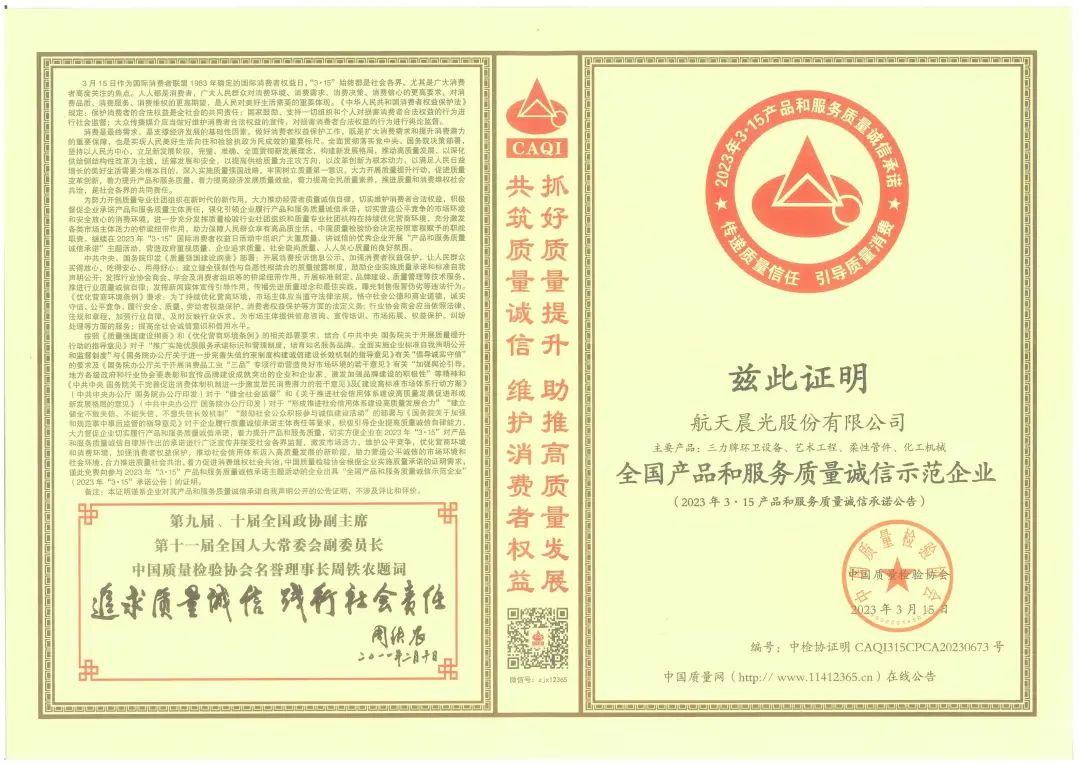 近日,中国质量检验协会组织开展了2023年“3.15”产品和服务质量诚信承诺主题活动,航天晨光荣获“全国产品和服务质量诚信示范企业”。