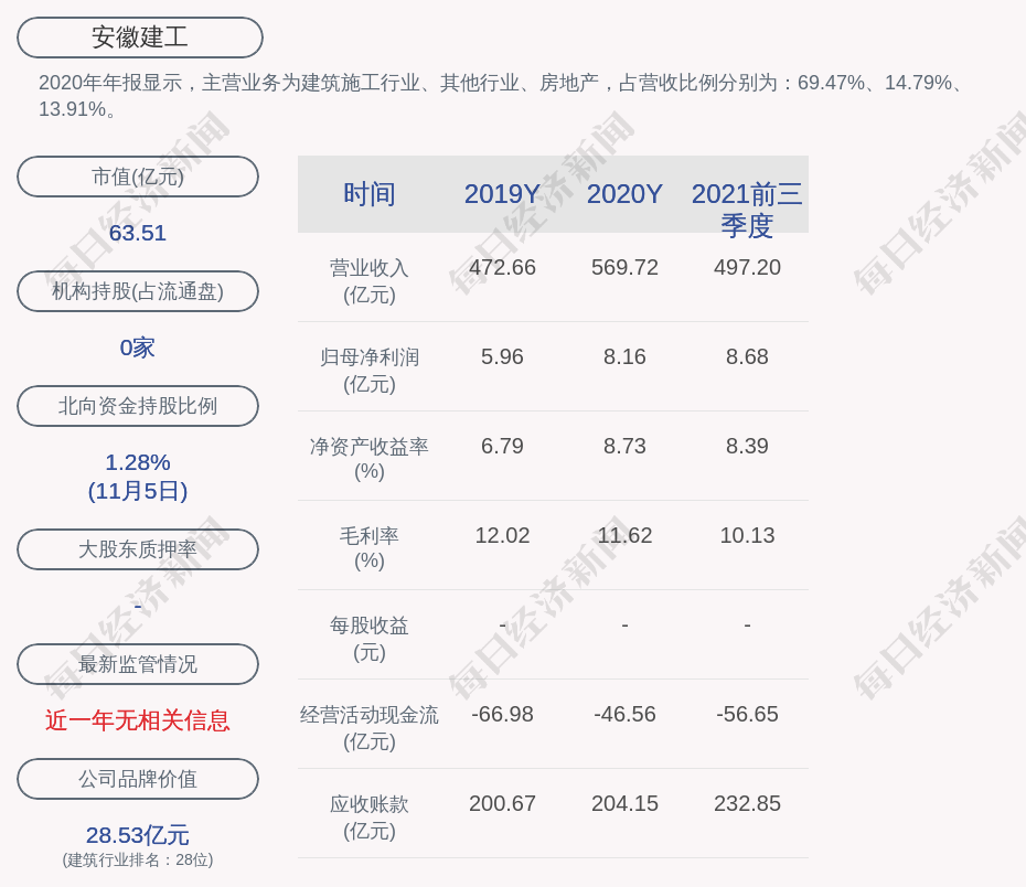 2020年年报显示,安徽建工的主营业务为建筑施工行业、其他行业、房地产,占营收比例分别为:69.47%、14.79%、13.91%。