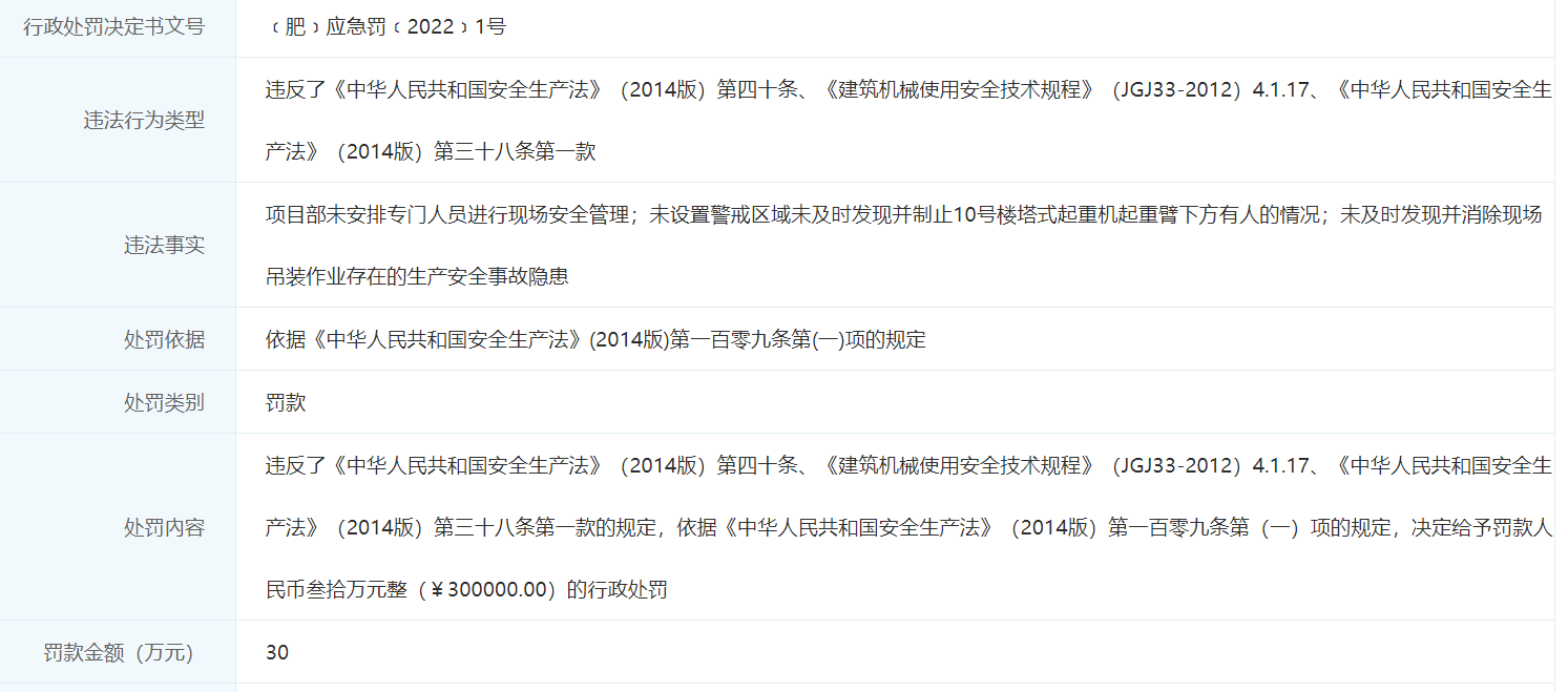 记者从肥西县应急管理局了解到,因违反《中华人民共和国安全生产法》相关规定,安徽三建工程有限公司被处以30万元罚款。