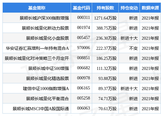 根据2021年报基金重仓股数据,重仓该股的基金共18家,其中持有数量最多的基金为景顺长城沪深300指数增强。景顺长城沪深300指数增强目前规模为52.52亿元,最新净值2.403(3月22日),较上一日下跌0.08%,近一年下跌15.15%。该基金现任基金经理为黎海威。黎海威在任的公募基金包括:景顺长城量化精选股票,管理时间为2015年2月4日至今,期间收益率为85.43%;景顺长城量化新动力股票,管理时间为2016年7月13日至今,期间收益率为114.4%;景顺长城量化平衡混合,管理时间为2017年12月27日至今,期间收益率为40.58%。