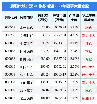 景顺长城沪深300指数增强的前十大重仓股如下: