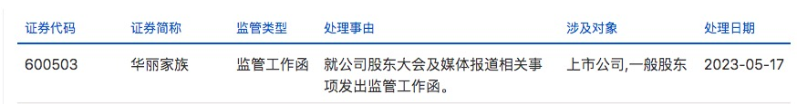 5月17日晚间,上交所向华丽家族及其一般股东下发监管工作函,处理事由为“就公司股东大会及媒体报道相关事项发出监管工作函”。