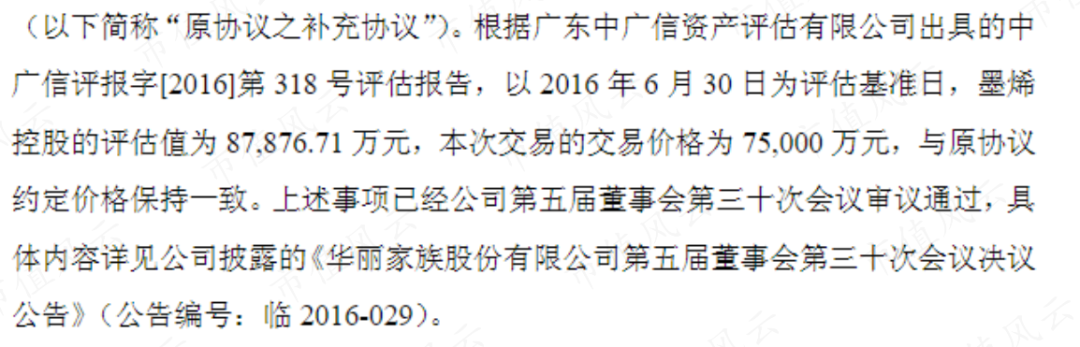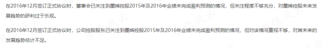 在2016年年末正式签订协议之时,公司在明知墨烯控股2015年业绩(亏损0.2亿)大幅低于预估,且2016年不见好转(亏损0.3亿)的情况下,依然以7.5亿进行收购。
