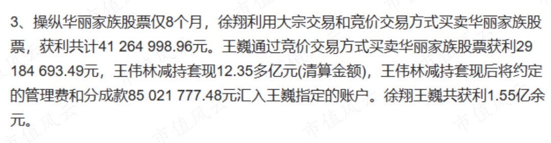 2010年,公司董事长王伟林为解决资金困难,决定套现华丽家族股票。为防止大股东减持引来股价崩盘,王伟林请徐翔操盘抬高股价,并付给徐翔减持总金额2%的“管理费”。